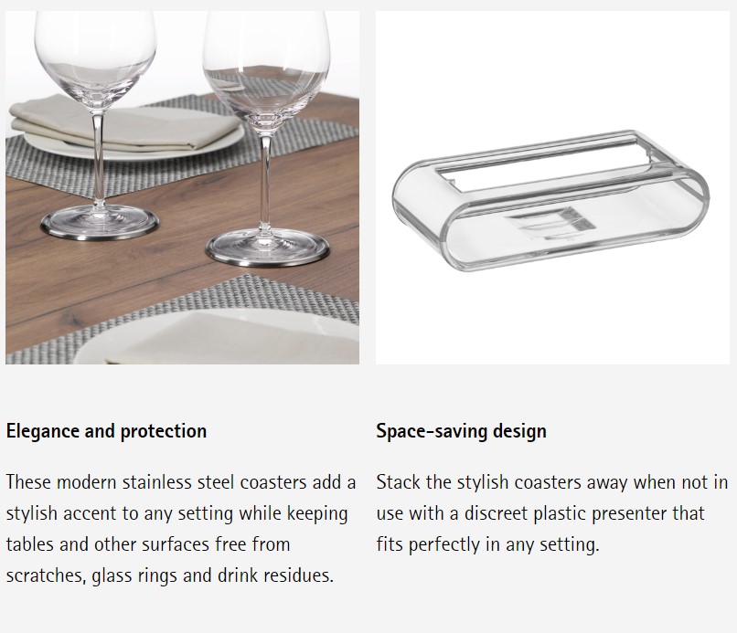 The perfect addition to any kitchen or bar, Clever & More Drink Coasters by WMF add a modern accent to any setting while protecting tables and other surfaces from scratches, glass rings and drink residues. With a sleek plastic holder to neatly stack the coasters away when not in use, the stylish 7-piece coaster set is perfect for cocktail parties, mealtimes or professional use at the bar. Expertly crafted from sleek, robust and extremely hard-wearing Cromargan®: stainless steel 18/10 in a satin finish — discover 6 premium coasters at WMF standards of quality, with a promise of lasting performance that stands the test of time.