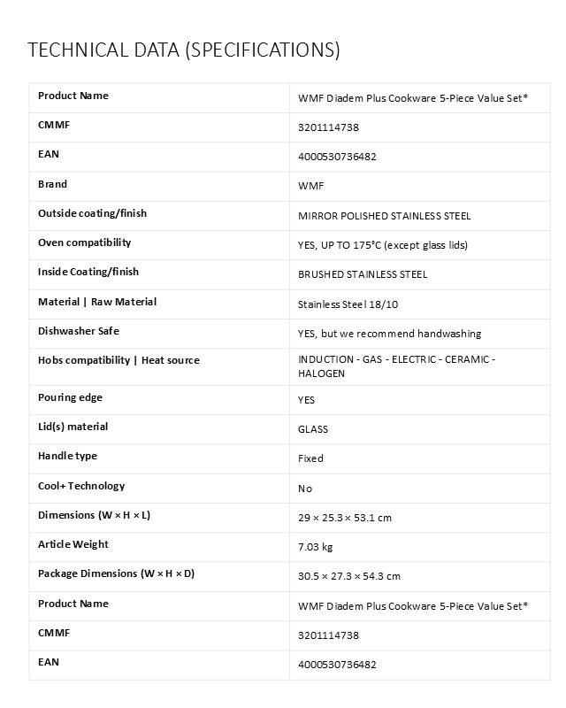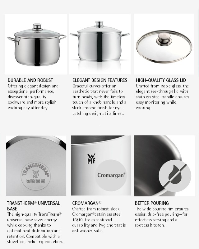 Exceptional cookware and kitchen tools that combine performance with aesthetics: The WMF Diadem Plus Cookware Set adds a touch of refinement to your home cooking, with elegant design and high-quality results every day. Our premium cookware boasts outstanding durability, expertly crafted from high-quality Cromargan®: stainless steel 18/10: dishwasher safe, acid-resistant and oven-proof up to 200 °C (lid up to 130°C), ensuring full flavor and performance that's built to last. Discover outstanding pots and pans that bring together convenient features like easy-pouring wide rims, exquisite design with graceful curves, stylish knob handles, and a sleek chrome aesthetic for timeless elegance day after day. This starter set offers everything you need for a fully equipped kitchen: Braising pan 20cm with elegant glass lid, soup pots 16/20/24cm with elegant glass lids, saucepan 16cm.