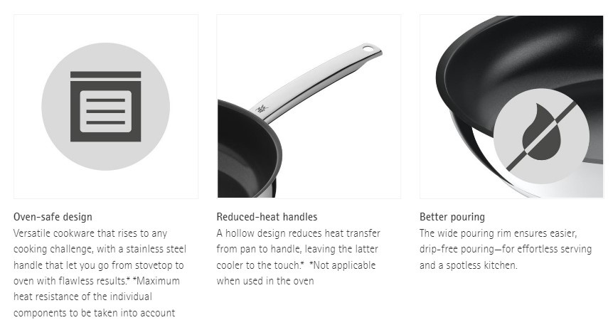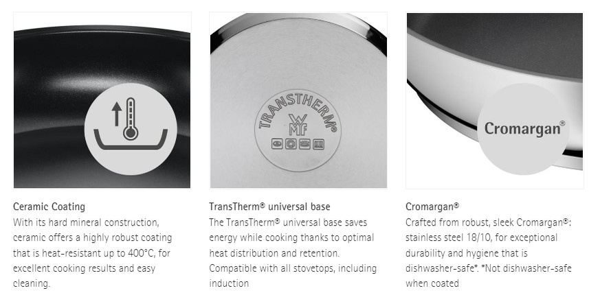 The WMF Durado Wok Pan features the perfect format for a wide variety of Asian culinary delights, ensuring all your favorite recipes cooked to perfection. Mouth-watering stir-fries and curries are easier than ever. Its robust ceramic coating is heat-resistant up to 400°C, offering excellent cooking results and easy cleaning. At the same time, its TransTherm® universal base ensures optimal heat distribution and retention that saves energy while cooking. Crafted from sleek Cromargan®: stainless steel 18/10, this practical kitchen pan goes straight from stovetop to oven for a flawless finish. Rounding it off are convenient features, including reduced-heat handles and a wide pouring rim for drip-free serving and a spotless kitchen. Compatible with all stovetops, including induction.