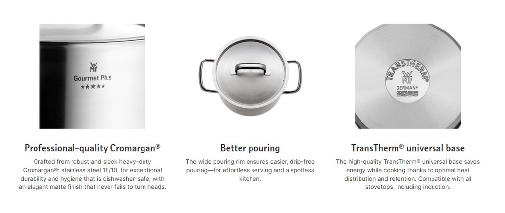 Discover exceptional cookware that puts 5-star quality within reach: The WMF Gourmet Plus Frying Pan was designed to bring restaurant-quality results to your home cooking, for elegant cookware that ensures flawless performance day after day. Convenient features come together for an outstanding frypan: a reduced heat handle when used on the stovetop and an extra easy-pouring wide rim. Master everything from comfort food like scrambled eggs and bacon to haute cuisine like seared ahi tuna steaks with this classic among frying pans, with a long handle and broad cooking space—a must in every kitchen. Our premium cookware boasts outstanding durability, expertly crafted from high-quality Cromargan®: stainless steel 18/10: dishwasher safe, acid-resistant and oven-proof, ensuring full flavor and performance that's built to last with a sleek matte finish that never fails to impress. Cooking is effortless with the TransTherm® universal base, compatible with all stovetops, including induction.