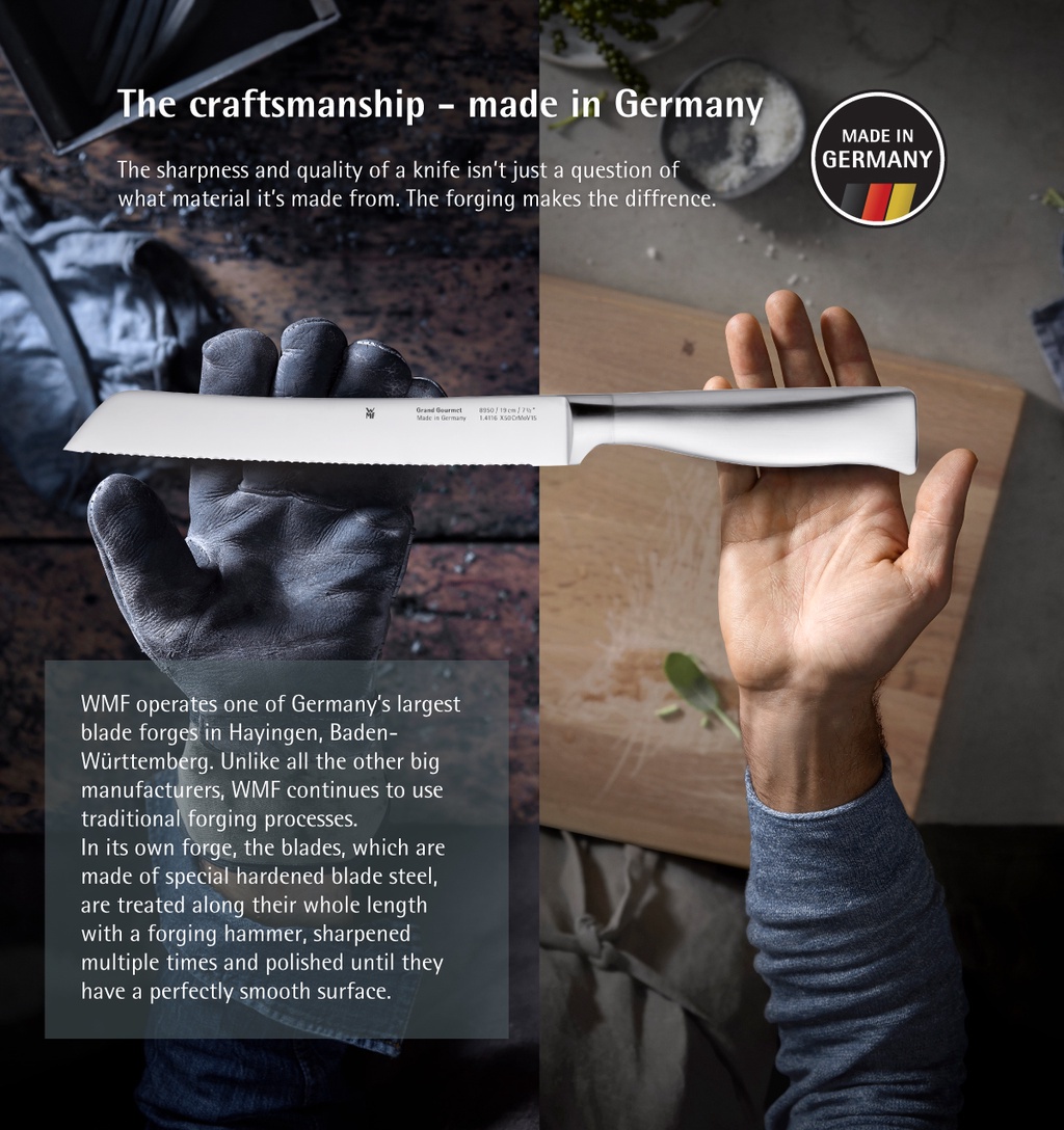 Material: Forged blade made of rust-free and acid resistant speciality blade steel. Long lasting sharpness thanks to the hardened blade. Handle without grooves made of high-quality rust-free Cromargan stainless steel.