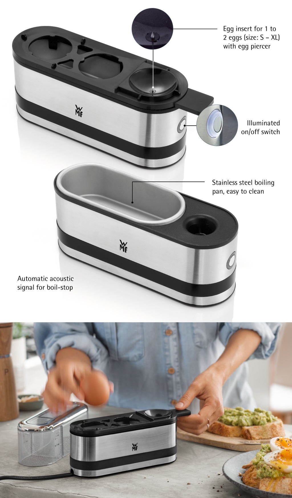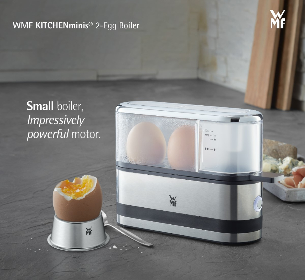 The pinnacle of exquisite aesthetics, compact design and high performance, the WMF KITCHENminis Two-egg boiler is crafted from WMF's exclusive patented Cromargan®, ensuring robust, long-lasting performance, with a chrome matte finish that never fails to impress.