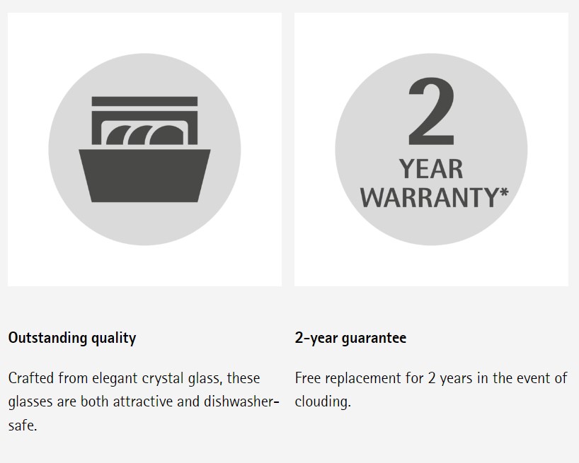 The dishwasher safe crystal glasses are specially hardened and more scratch resistant. The special hardening process at the especially stressed areas makes the glasses more break proof with the simple and functional design.