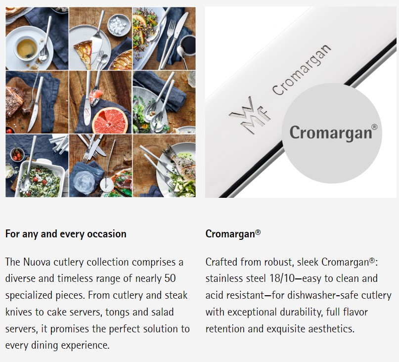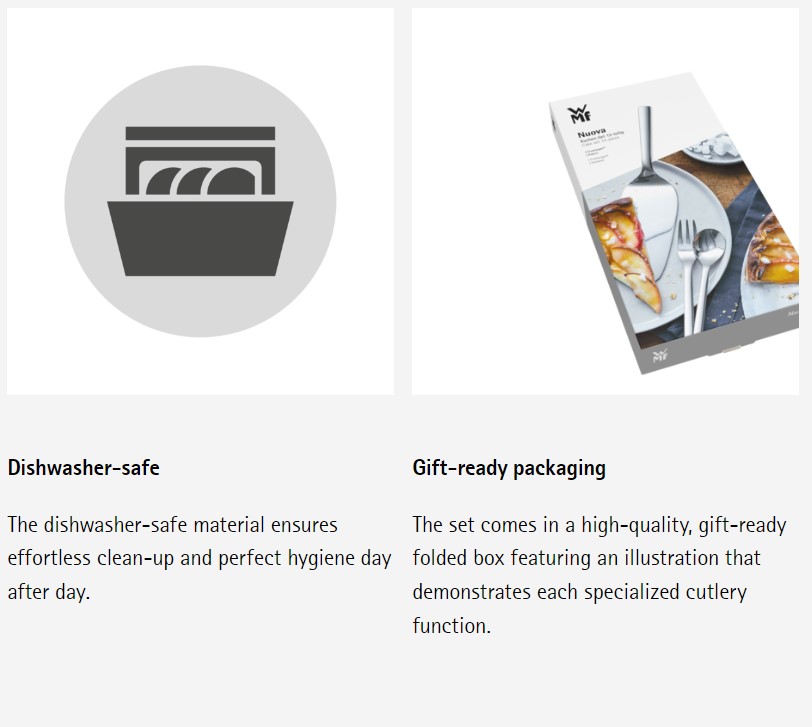 Discover the perfect cutlery solution for any and every occasion. With the Nuova collection by WMF, a timeless yet functional range of diverse cutlery—comprising nearly 50 specialized pieces, from tableware to serving utensils—makes every moment a true dining experience. These carefully selected cutlery pieces are perfect companionship for your set table and ideal for all kinds of cakes, fruits and other desserts. This stunning set is expertly crafted from high-quality Cromargan: stainless steel 18/10, for exceptional durability with an exquisite aesthetic that never fails to impress. Manufactured with all the skill and know-how that has made WMF's renown, this unique serving cutlery is dishwasher-safe, easy to care for and resistant against food acids. The set —including 6 teaspoons, 6 cake forks, and a stylish cake server—comes in a high-quality, gift-ready folded box with illustration.