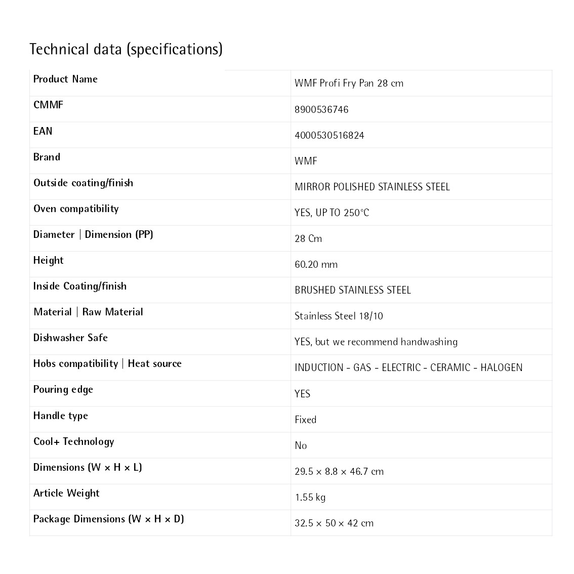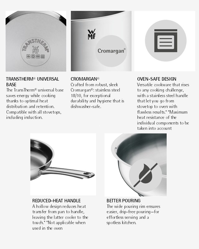 With classic stainless steel cookware comes the promise of flawless professional results. The WMF Profi Frypan offers uncompromising performance in stunning, yet durable Cromargan®: stainless steel 18/10, with a design that goes straight from stovetop to oven for timeless cooking day after day . Compatible with all stovetops, including induction , its TransTherm® universal base ensures optimal heat distribution and retention for outstanding result, while a range of convenient features make cooking effortless—including comfortable reduced-heat handles and a wide easy-pouring rim. With WMF , mastering new and old recipes like the professionals has never been easier.