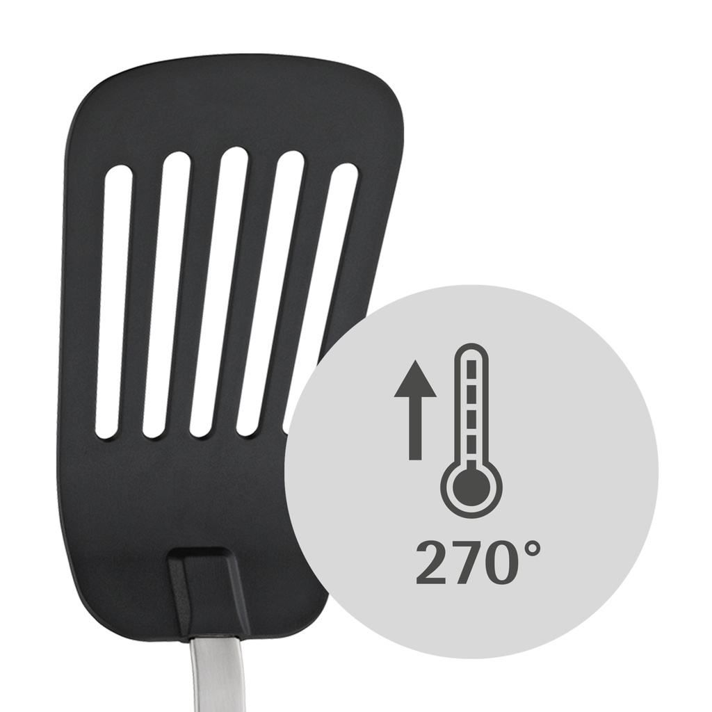 With the functional and elegant turner from WMF, you can turn pan-fried and gently cooked food elegantly and effortlessly. The turner made of Cromargan® is ideal for stainless steel pans with a non-sensitive surface. A turner with a plastic spoon protects the surface of non-stick pans. The compact support surface and the wide slots allow excess fat to drain off quickly. The different versions of WMF turner are practical, absolutely durable and impress with their attractive design.