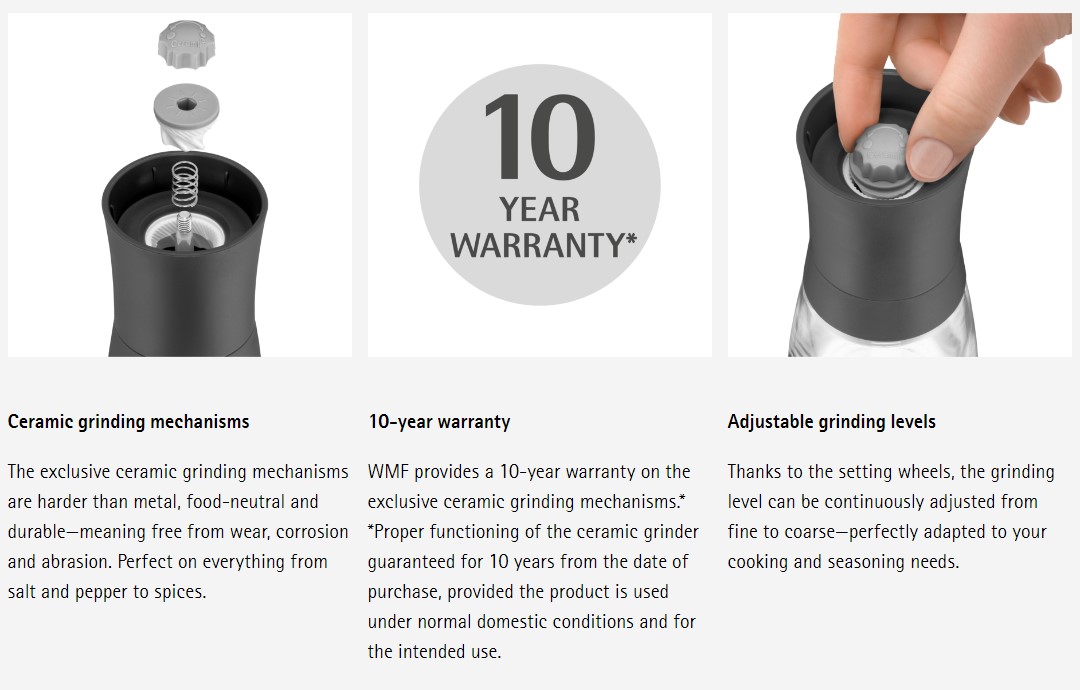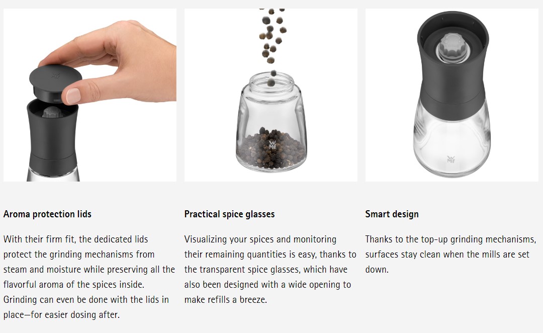 From salt and pepper to flavorful spices, the Trend Spice Mill Set by WMF promises fresh grinding in an instant. The exclusive ceramic grinding mechanisms—harder than metal, food-neutral, and free from wear, corrosion and abrasion—come with a 10-year warranty*. Perfectly adapted to all your seasoning needs, the convenient setting wheels offer adjustable grinding from fine to coarse, while aroma protection lids protect the spice grinders' mechanisms from moisture—all while preserving the full aroma of the spices inside. Crafted from transparent glass and matte high-quality plastic, these spice mills ensure practical visualization and refilling via a wide opening. Rounding it off is the grinding mechanisms' top-up design to keep surfaces clean, as well as dishwasher-safe spice glasses for effortless cleaning.
